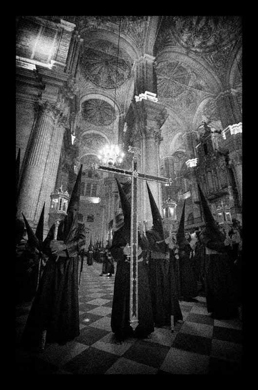 Nazarenos del Sagrado Descendimiento en la Catedral de Málaga, realizando la estación penitencial del Viernes Santo.(José Mª Díaz B.)