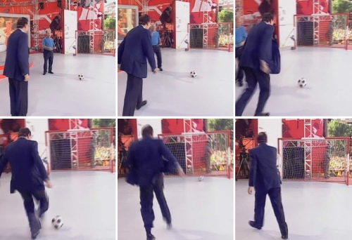 En el set que Cuatro tiene desplegado en los Jardines del Descubrimiento en la Plaza de Colón de Madrid, Mariano Rajoy se prestó a tirar un penalti a puerta vacía. No falló. (Imagen TV)
