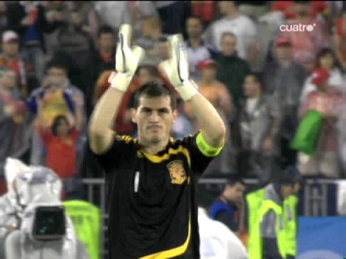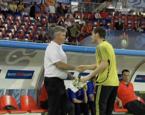 Iker Casillas, saluda al seleccionador ruso, Guus Hiddink, ex entrenador del Real Madrid. (Imagen TV)