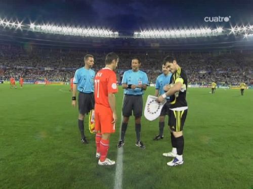 El sorteo inicial. España eligió campo y Rusia balón. (Imagen TV)