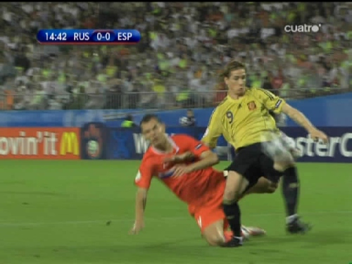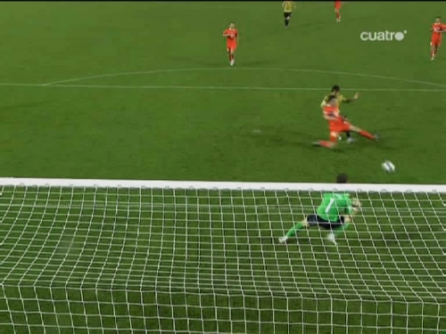 Dani Güiza controla y bate al portero ruso Igor Akinfeev. (Imagen TV)
