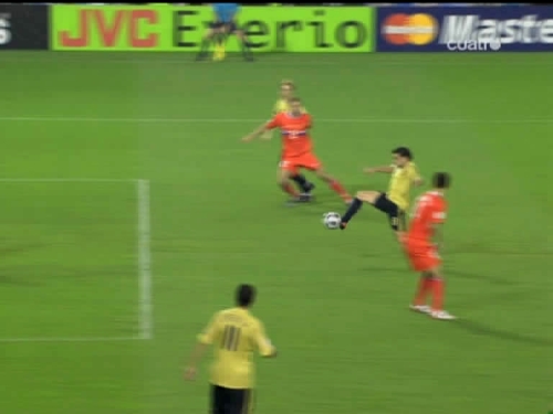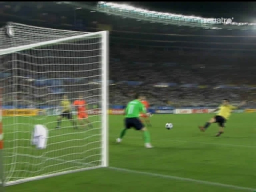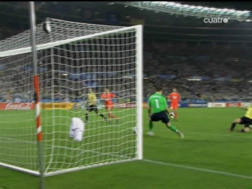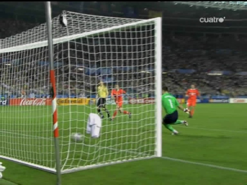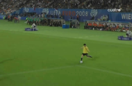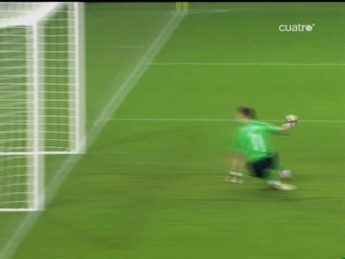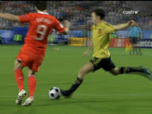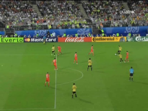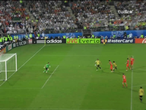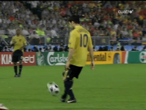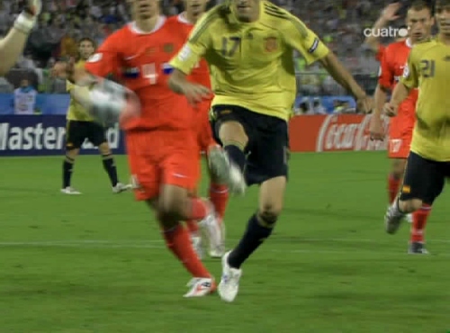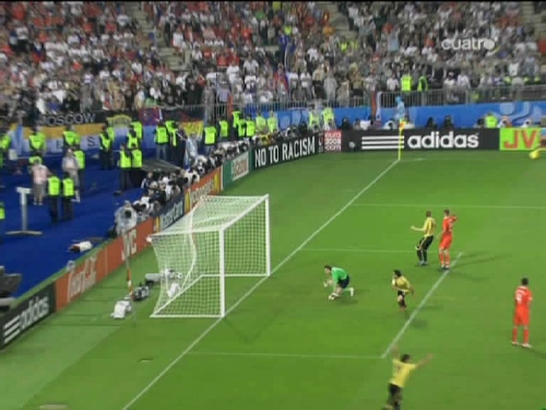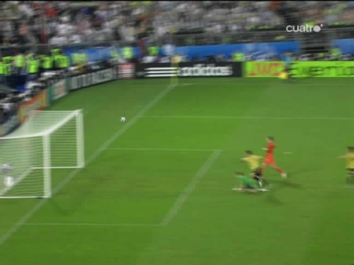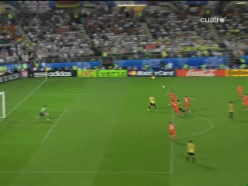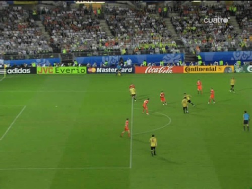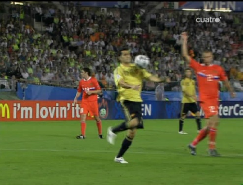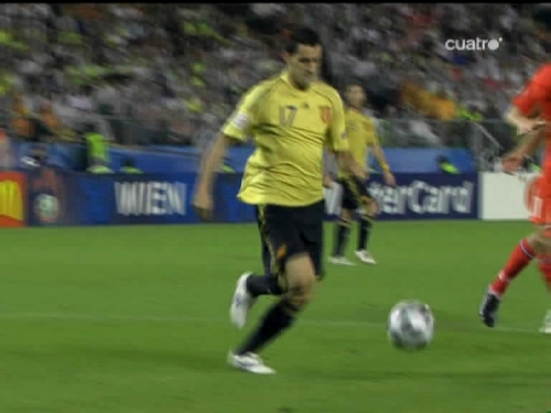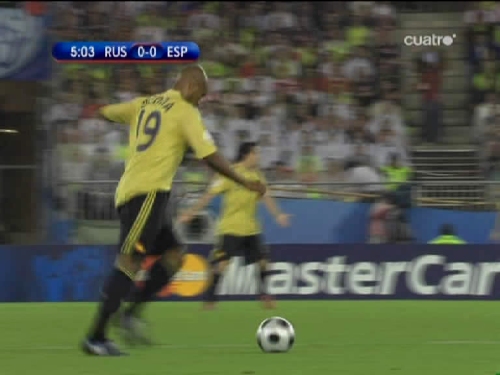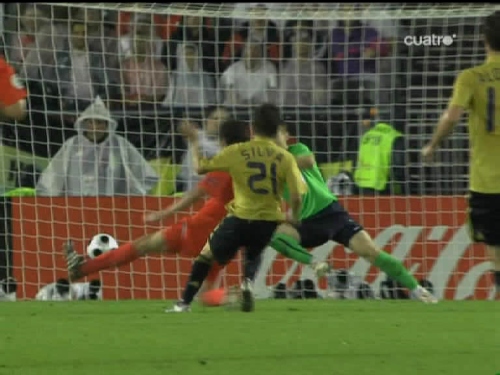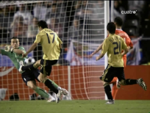 Jugada del tercer gol. Cesc, el mismo que sirvió a Güiza en el segundo, controla y pasa el esférico al centro del área pequeña, donde lo esperaba Silva. (Imagen TV)