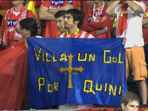 Aficionados españoles con una pancarta de ánimo a Villa. "Villa un gol por Quini". (Imagen TV)