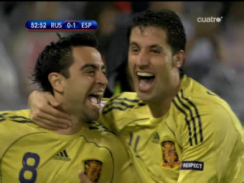 En la imagen, Xavi impacta el centro chut de Iniesta. (Imagen TV)