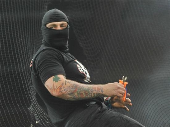 Un ultra encapuchado serbio corta la malla