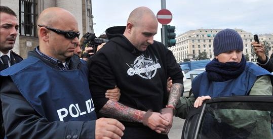 Policías italianos trasladan a Ivan Bogdanov, cabecilla de los aficionados serbio. Fue detenido en el maletero del último autobús de los serbios, listo para partir de Génova
