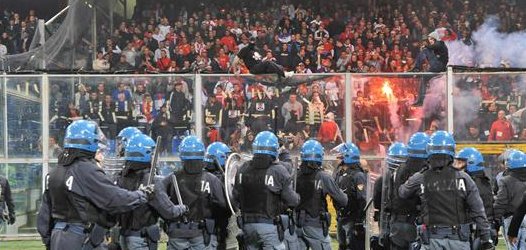 Policía italiana toman posición frente a aficionados serbios que permanecen en las graderías.