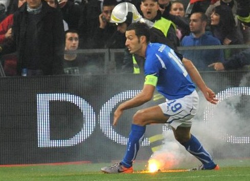 Policías italianos muestran parte de los objetos incautados a los aficionados serbios.