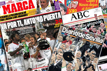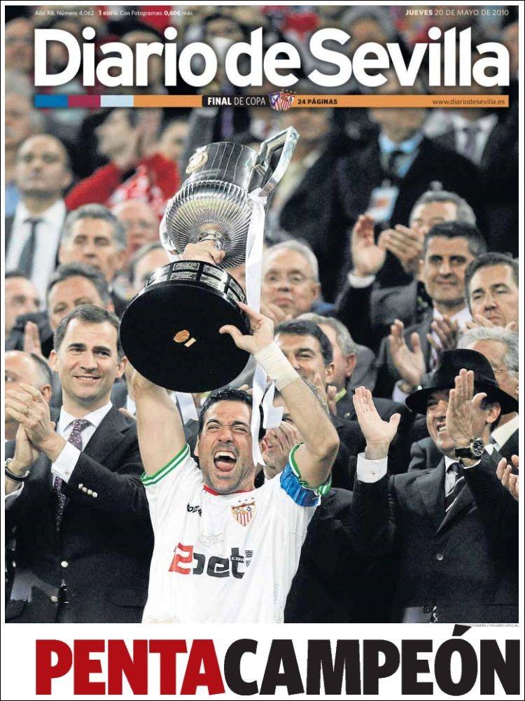 El diario sevillano titula "Pentacampeón" y publica una foto de Palop recogiendo el trofeo con la camiseta de Antonio Puerta.