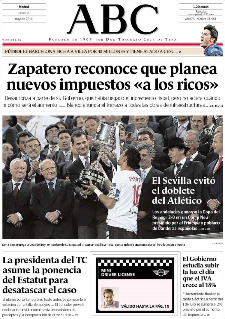 El diario ABC dedica buena parte de su portada al triunfo sevillista y también destaca un Camp Nou plagado de banderas de España.