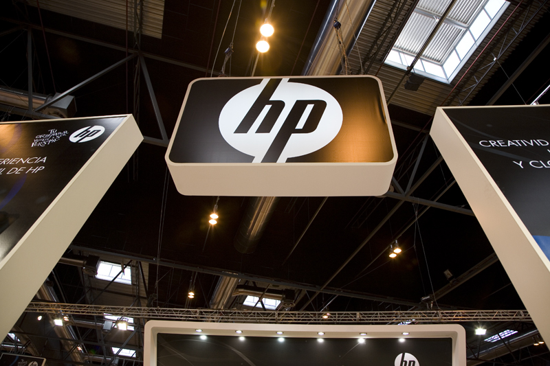 Dos monolitos flanquean al logotipo de Hewlett Packard, colgado del techo del pabellón.