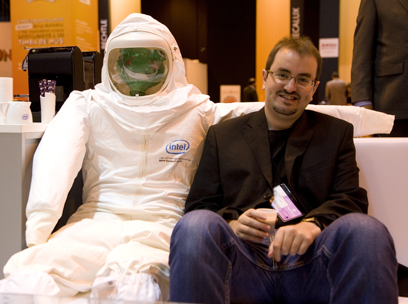 Daniel Rodríguez Herrera se toma un café en el stand de Intel junto a un visitante de otro planeta de paso por la feria.