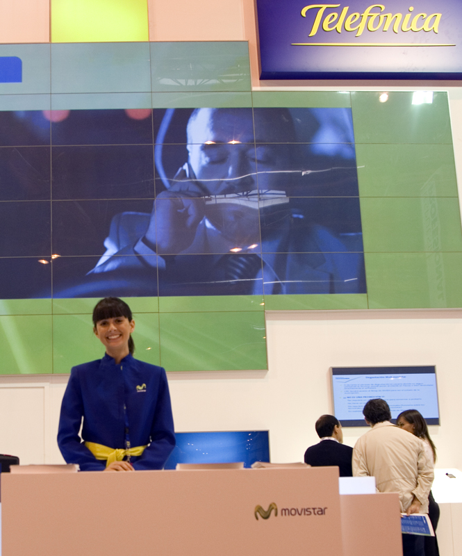 Una azafata sonríe en el stand de Telefónica, uno de los mayores y mejor situados del SIMO.