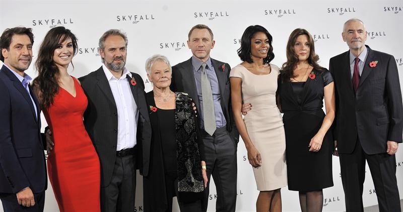 (i-d) El actor español Javier Bardem, la actriz francesa Berenice Marlohe, el director británico Sam Mendes, la actriz británica Judi Dench, el actor británico Daniel Craig, la actriz británica Naomie Harris, y los productores Barbara Brocoli y Michael G. Wilson, posan durante el pase gráfico de la próxima película de James Bond. EFE/Andy Rain