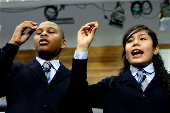 Los niños del colegio de San Ildefonso Brandon Cabrera -quien ya cantó el pasado año "el Gordo"- y Valeria Castañer cantan el Tercer Premio de la Lotería de Navidad, el 10.104. EFE