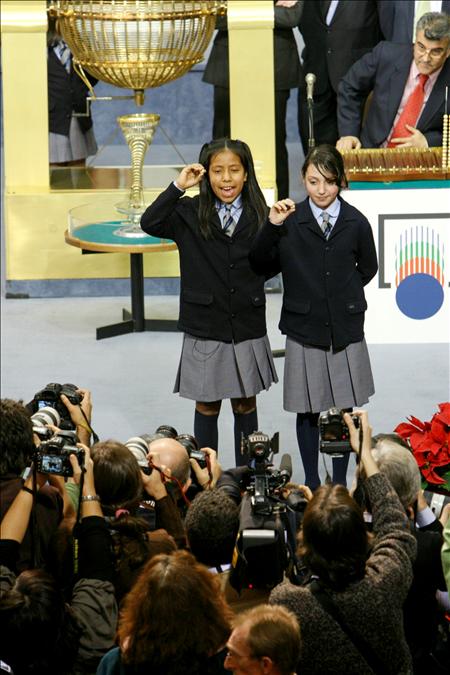 Las niñas del colegio de San Ildefonso Alicia Rodríguez y Yahaira Gonzaga en el momento en el que cantaron el Gordo, que correspondió al número 78.294. EFE