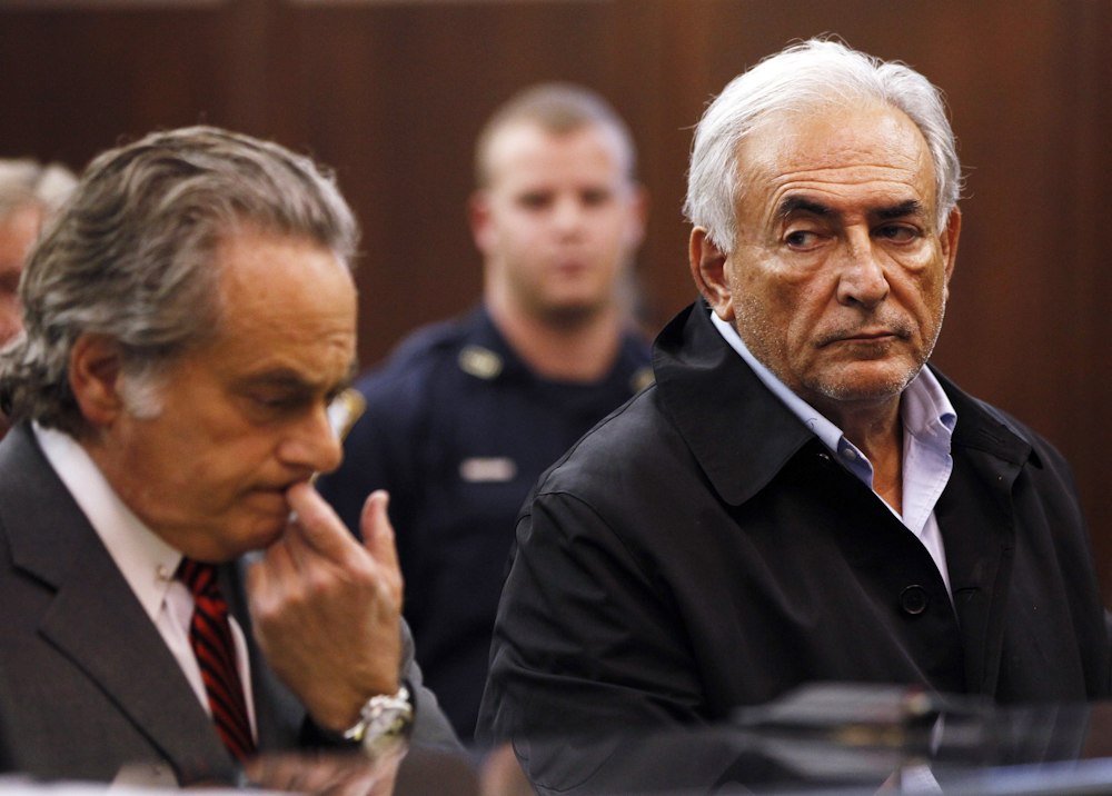 El director gerente del Fondo Monetario Internacional conversa con su abogado durante la comparecencia ante la juez