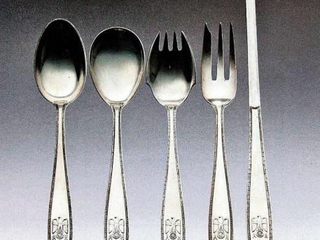 Juego de cinco cubiertos con el águila, la cruz gamada y sus iniciales por 1.800 euros.
