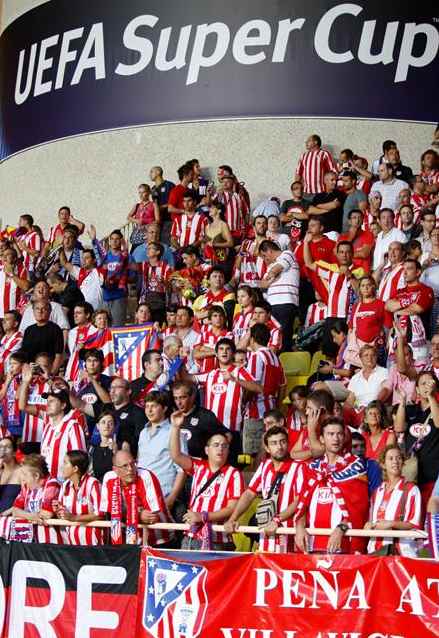 Decenas de personas fotografían a los jugadores del Atlético mientras levantan por primera vez en su historia la Supercopa de Europa.