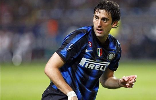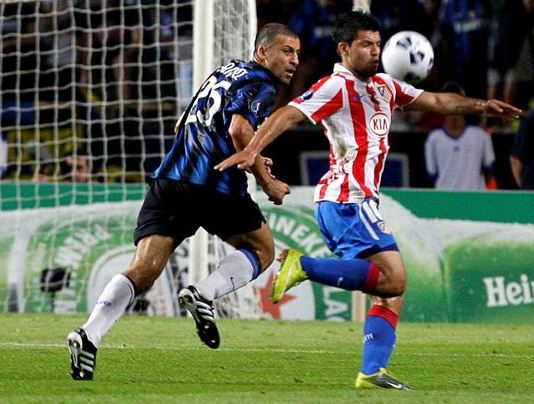 El jugador del Atlético de Madrid Jurado (i) celebra el segundo gol ante el Inter de Milán, marcado por el "Kun" Agüero ante la desesperación de Julio Cesar.