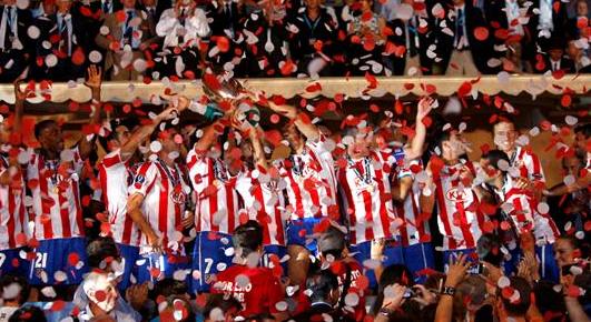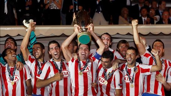 El capitán del Atlético de Madrid Antonio López (c) levanta el trofeo, rodeado por sus compañeros, tras imponerse al Inter de Milán por 2-0 en el partido de la Supercopa de Europa disputado esta noche en el estadio Louis II de Mónaco.