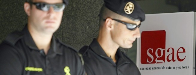 Agentes de la Guardia Civil en la puerta de la SGAE, durante el registro efectuado este viernes.