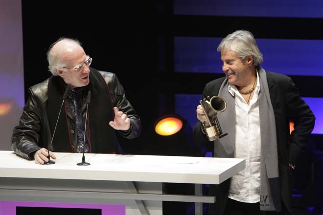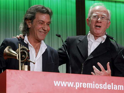 Bautista le entrega un premio al compositor gibraltareño Albert Hammond