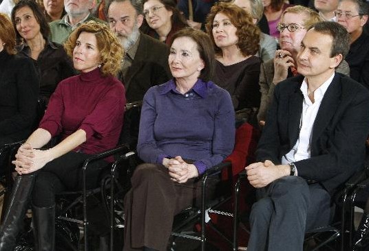 Bautista es escuchado atentamente por la actriz Pilar Bardem durante una rueda de prensa