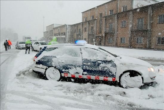 Los Mossos d' esquadra desvian los coches en el puesto fronterizo de La Jonquera (Gerona), que ha sido cerrado al tráfico a todo tipo de vehículos por el temporal de nieve que se registra en las últimas horas en gran parte de Cataluña.