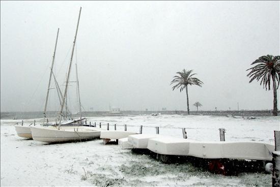 El largo invierno, al que aún le quedan dos semanas de vida, se está resistiendo a dejar Cataluña, como muestra el temporal de nieve y viento que está afectando a prácticamente todo el territorio, incluso a las zonas costeras como la de Castello d' Empuries (Girona), en la foto.