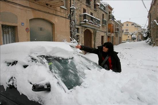 Una vecina de Belltall (Tarragona) retira la nieve de su vehículo. El temporal de nieve que afecta a toda Cataluña ha cubierto casi todo el interior y el prelitoral catalán, además del Pirineo, y ha llegado a poblaciones costeras como Arenys de Mar y a Barcelona.