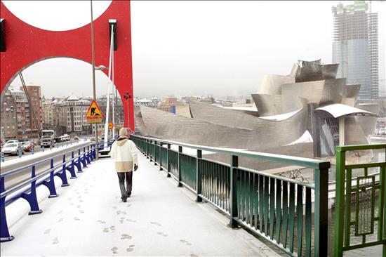 Vista del museo Guggenheim y del puente de La Salve, uno de los accesos a Bilbao, que ha amanecido con un ligero manto de nieve. La cota de nieve en la comunidad vasca se situará a nivel del mar.