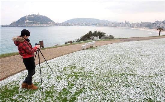 Una joven toma imágenes de la playa de la Concha de San Sebastián desde el Palacio de Miramar de la capital donostiarra, que amaneció con un ligero manto de nieve. La cota de nieve se sitúa a nivel del mar en la comunidad vasca.