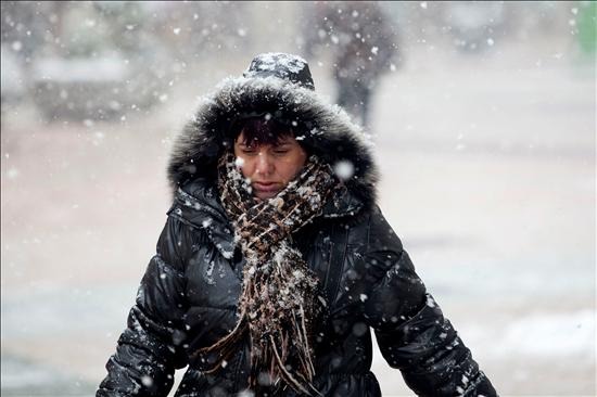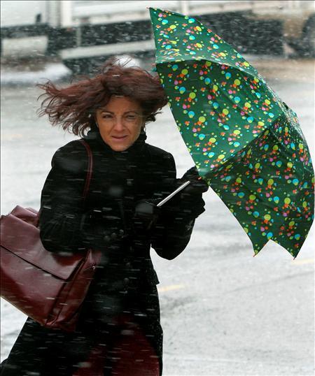 Una mujer intenta protegerse de la nieve y el viento en el barrio barcelonés del Valle Hebrón. La intensa nevada que afecta a la ciudad condal y a toda Cataluña ha activado la fase de alerta del Plan Neucat y causa afectaciones en las principales autovías y autopistas de la comunidad, mientras el transporte escolar se ha suspendido en diversas comarcas.