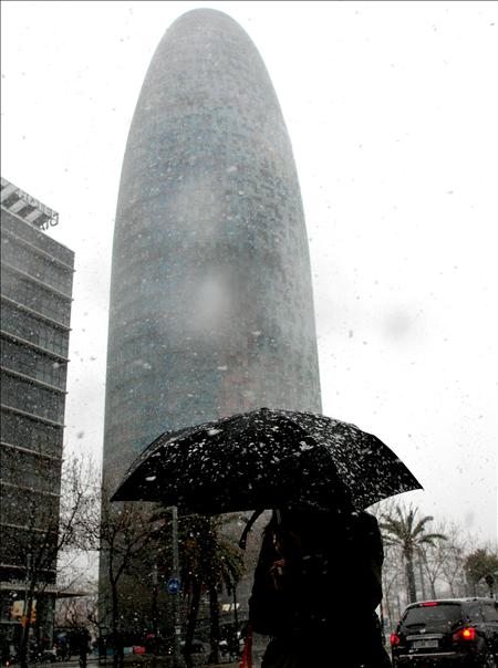 Una persona camina cerca de la torre Agbar en la ciudad condal. El temporal de nieve ha cubierto de nieve casi todo el interior y el prelitoral catalán, además del Pirineo, y ha llegado a poblaciones costeras como Arenys de Mar y a Barcelona, como esta imagen de la torre Agbar, aunque es en Osona donde las nevadas son, de momento, más intensas con grosores de hasta 20 centímetros.
