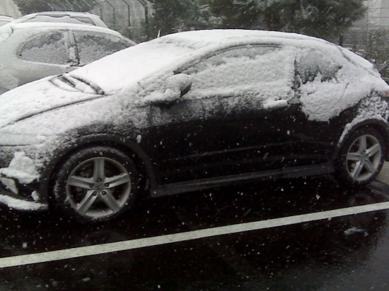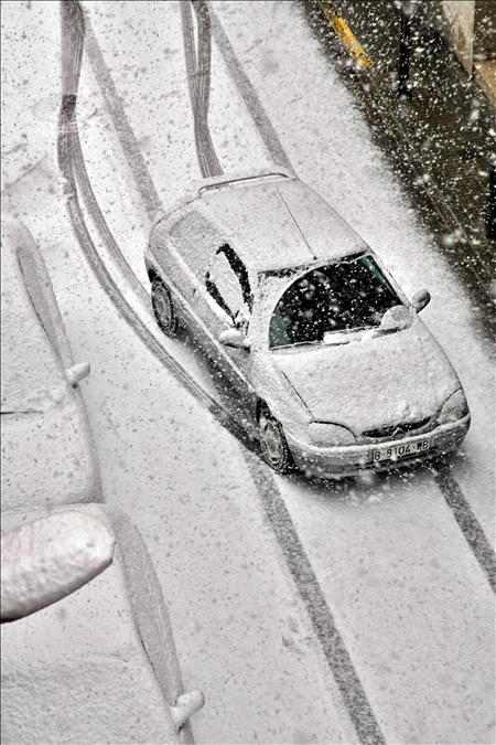Un coche intenta circular esta tarde, por el municipio de Cornellá de Llobregat (Barcelona), ciudad situada a 27 metros sobre el nivel del mar. El largo invierno, al que aún le quedan dos semanas de vida, se está resistiendo a dejar Cataluña, como muestra el temporal de nieve y viento que está afectando a prácticamente todo el territorio.