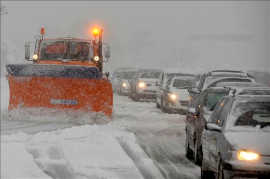 Una maquina quitanieves trabaja en la auotpista AP-7, cerca del puesto fronterizo de La Jonquera (Gerona), que ha sido cerrado al tráfico a todo tipo de vehículos por el temporal de nieve que se registra en las últimas horas en gran parte de Cataluña, y que afecta a 65 carreteras de la red viaria, y entre ellas a la AP-7 y a la N-II.