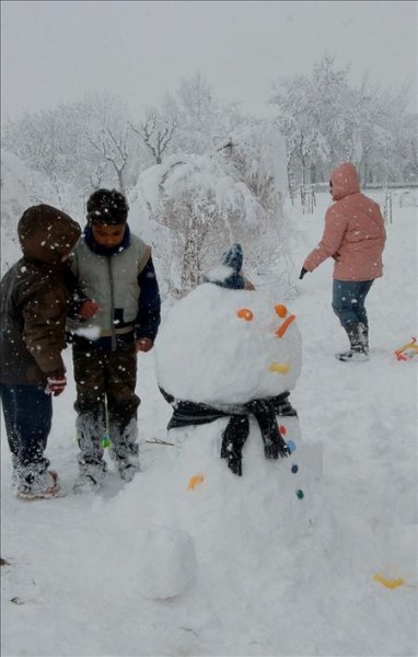 Unos niños juegan con la nieve en Guissona (Lleida). El largo invierno, al que aún le quedan dos semanas de vida, se está resistiendo a dejar Cataluña, como muestra el temporal de nieve y viento que está afectando a prácticamente todo el territorio.