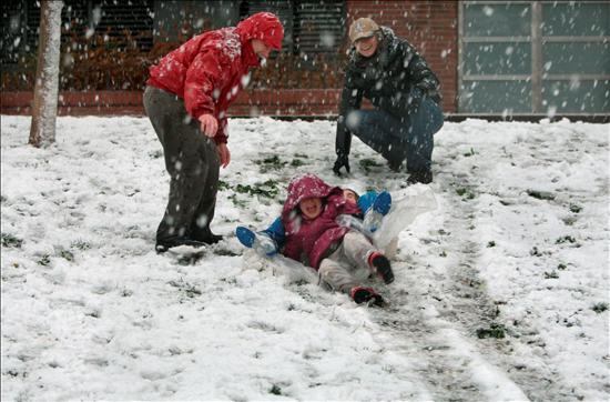 Unos niños se deslizan por la nieve en el barrio barcelonés de Sants. El largo invierno, al que aún le quedan dos semanas de vida, se está resistiendo a dejar Cataluña, como muestra el temporal de viento y nieve que está afectando a practicamente todo el territorio, está provocando numerosos problemas, tanto en la red viaria como ciudadana.