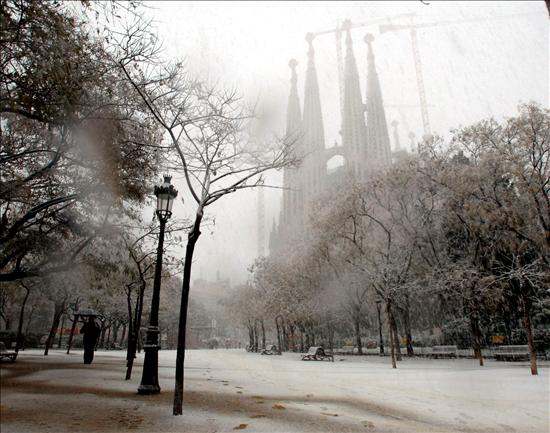 Vista del templo de la Sagrada Familia cubierto de nieve. El largo invierno, al que aún le quedan dos semanas de vida, se está resistiendo a dejar Cataluña, como muestra el temporal de nieve y viento que está afectando a prácticamente todo el territorio, provocando númerosos problemas tanto en la red viaría como ciudadana.