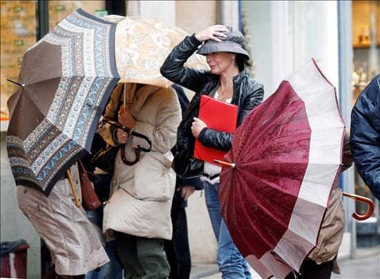 Varios transeúntes intentan controlar su paraguas en una céntrica calle de Santander debido al fuerte temporal de viento, con rachas de hasta 115 kilómetros por hora, que azota la cornisa cántabrica que se halla en alerta naranja