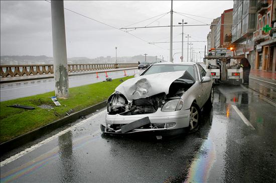 Las abundantes precipitaciones registradas esta mañana en La Coruña ocasionaron salidas de vía como la de este coche en el Paseo Marítimo de la ciudad, durante una jornada marcada por la fuerte intensidad del viento, que unido a las precipitaciones, obligó a decretar la alerta roja en las zonas costeras de A Coruña y Lugo