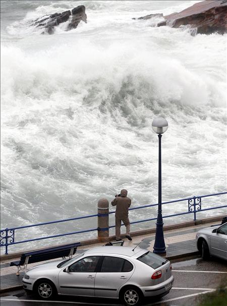 Un persona hace fotografías del estado de la mar en la dársena del Camello, en la capital cántabra, azotada por el oleaje producido por los fuertes vientos, con rachas de hasta 115 kilometros por hora, que soplan en la cornisa cántabrica y que mantiene activada la alerta naranja. EFE