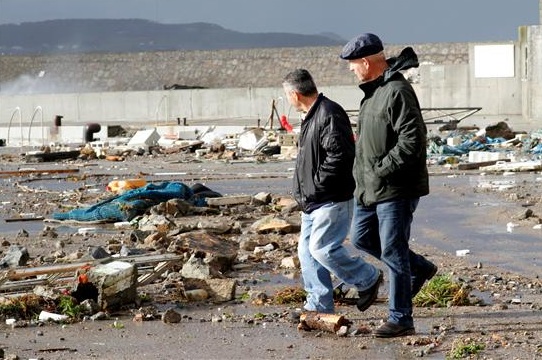 Aspecto que presentaba hoy en puerto de San Ciprián (Lugo) donde, debido al fuerte temporal de lluvia y viento que desde ayer afecta a la costa de Lugo, ha desaparecido la mitad de la escollera de la parte posterior del espigón, lo que ha hecho que el temporal entrara directo en el puerto y dejase totalmente desechas tres casetas de marineros. EFE/Eliseo Trigo