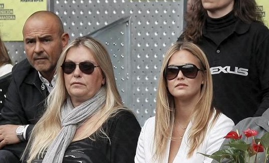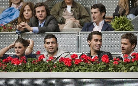 La actriz Amaia Salamanca y los jugadores del Real Madrid Raúl Albiol (i), Álvaro Arbeloa (c) y Xabi Alonso (d) observan las evoluciones del tenista español Rafael Nadal durante su partido de los cuartos de final del torneo Masters 1.000 de Madrid contra el francés Gael Monfils, al que derrotó por 6-1 y 6-3.