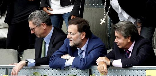 De izq. a dcha. Alberto Ruiz Gallardón, alcalde de Madrid; Mariano Rajoy, presidente del PP; y Manolo Santana, director del Masters 1.000 de Madrid, durante el partido de cuartos de final en el que el español Rafael Nadal derrotó al francés Gael Monfils.