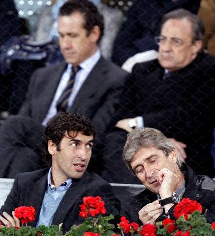 El capitán del Real Madrid, Raúl González (delante i.), el entrenador del Real Madrid, el chileno Manuel Pellegrini (delante d.), el director General del club blanco, Jorge Valdano (detrás i.), y el presidente del club, Florentino Pérez (detrás d.), asistieron al partido correspondiente a los cuartos de final del Masters 1000 de Madrid, que disputaron el letón Ernest Gulbis y el suizo Roger Federer en la Caja Mágica.