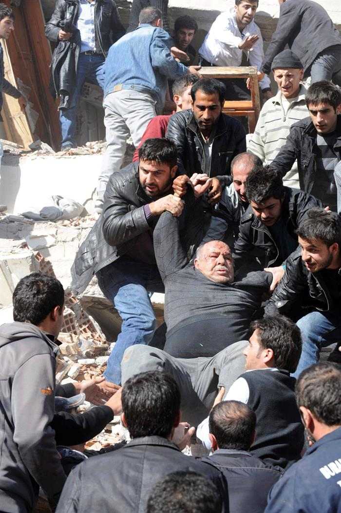 Turcos participan en la operación de rescate de personas en un edificio colapsado después de seismo en Van, al este de Turquía.