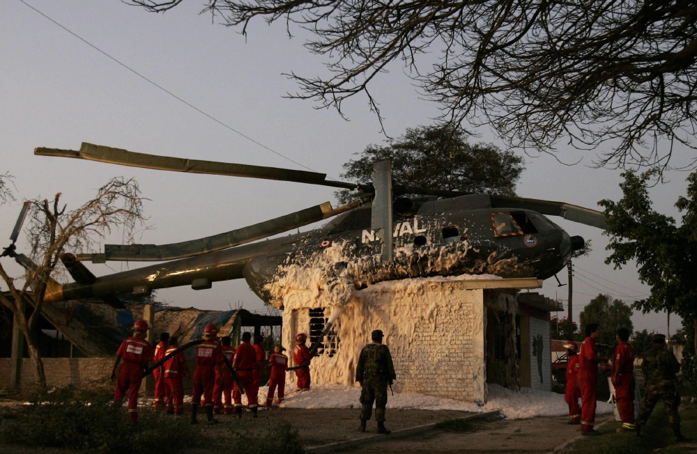 Bomberos manipulan un helicóptero de la Fuerza Aérea Peruana estrellado contra el campo ferial de la ciudad de Ica, cuando transportaba ayuda humanitaria para los damnificados del terremoto del pasado miércoles. (EFE)