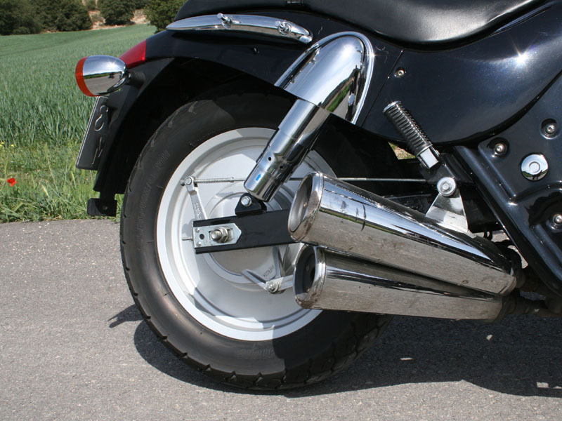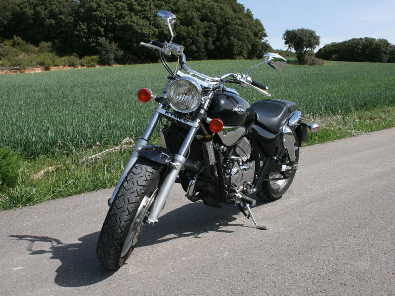 Entre las custom que podemos encontrar en las calles está la oferta del fabricante coreano Kymco, la Venox 250, unamoto barata y de amplias dimensiones que fácilmente puede pasar por "una de las grandes". Sus cromados, su diseño y su vistoso motor en V son los grandes aliados de esta custom Long & Low (larga y baja).